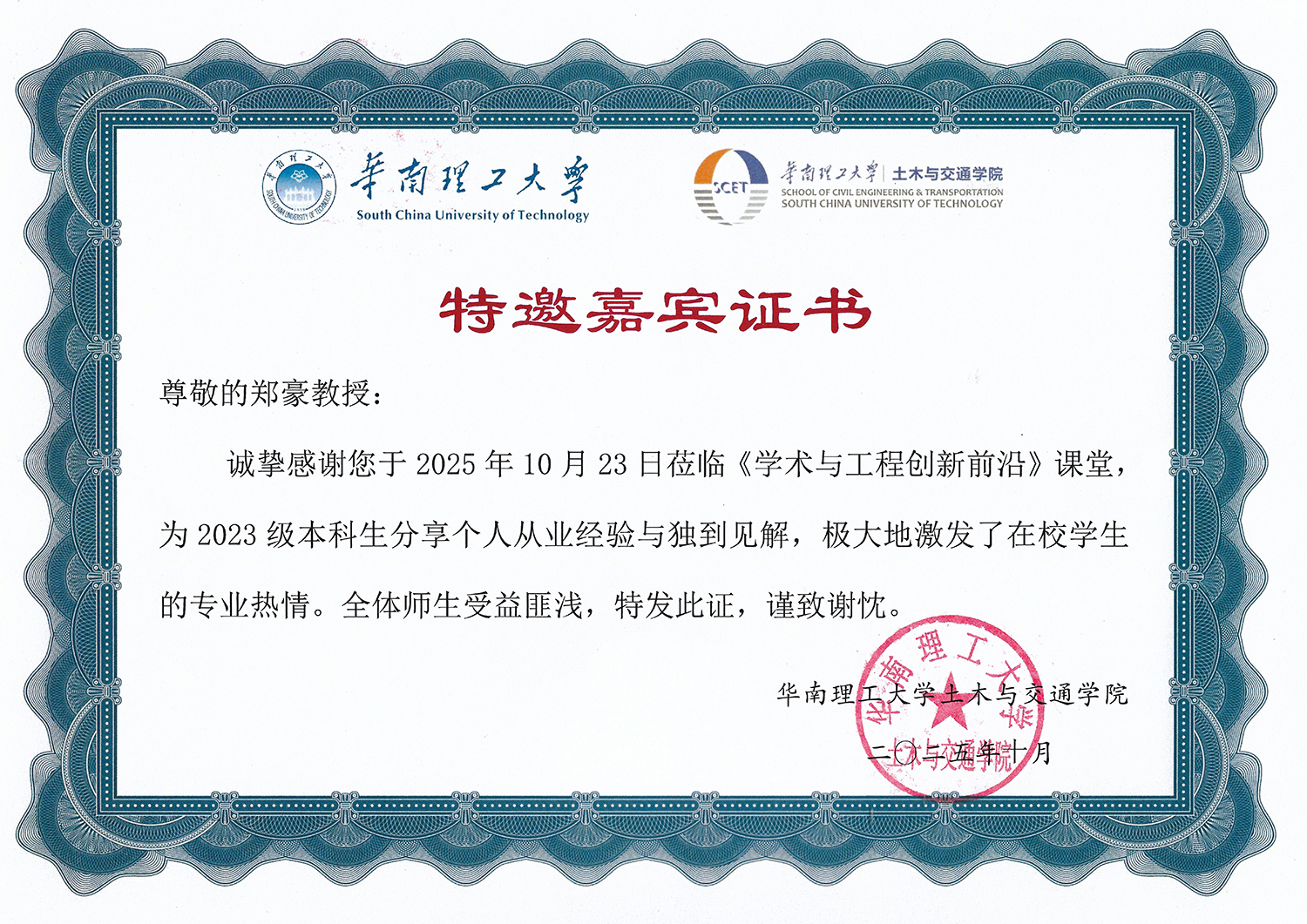 is giving a lecture in South China University of Technology